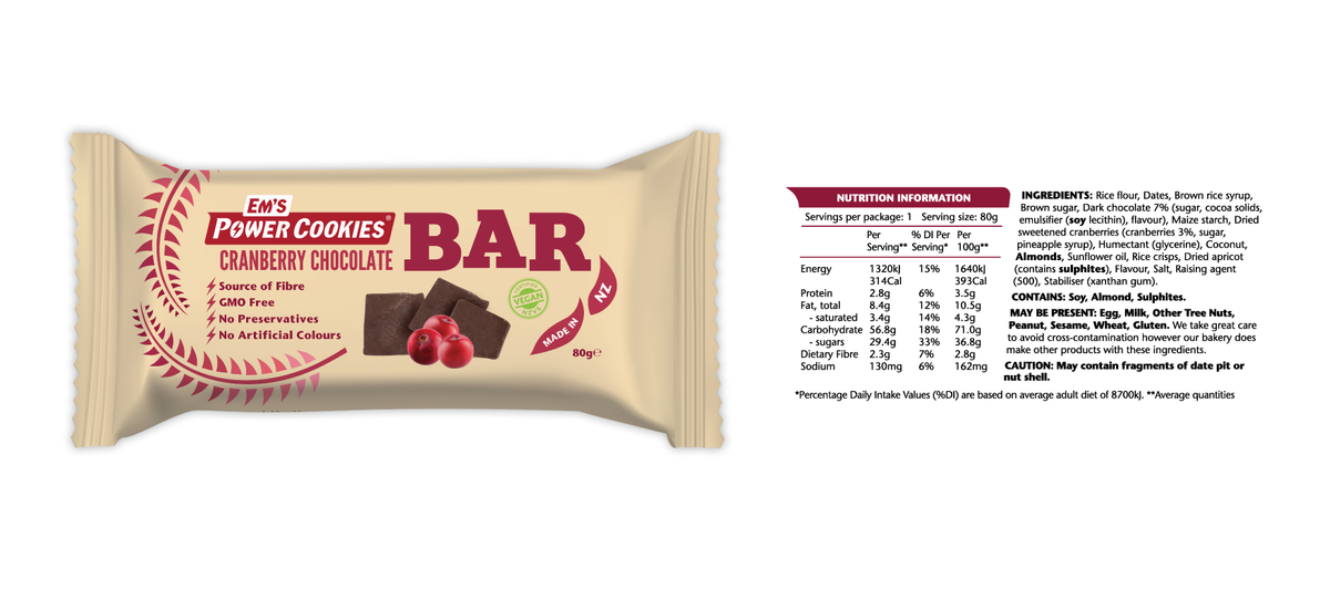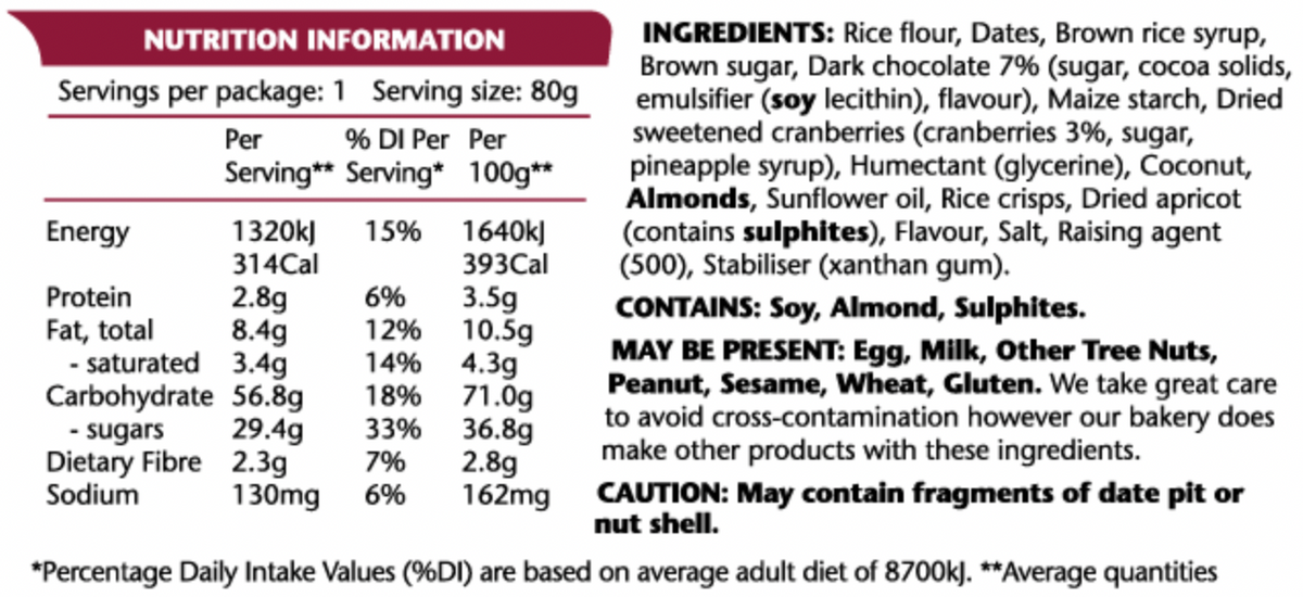 - Natural sugars from dates, cranberries, almonds, coconut and apricots