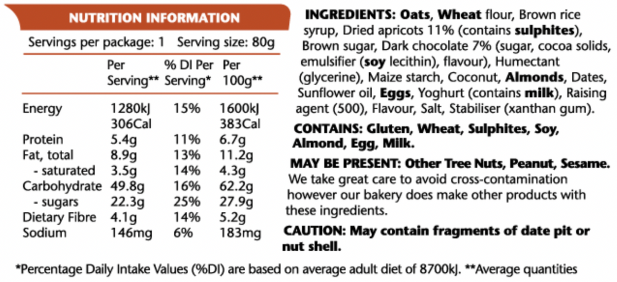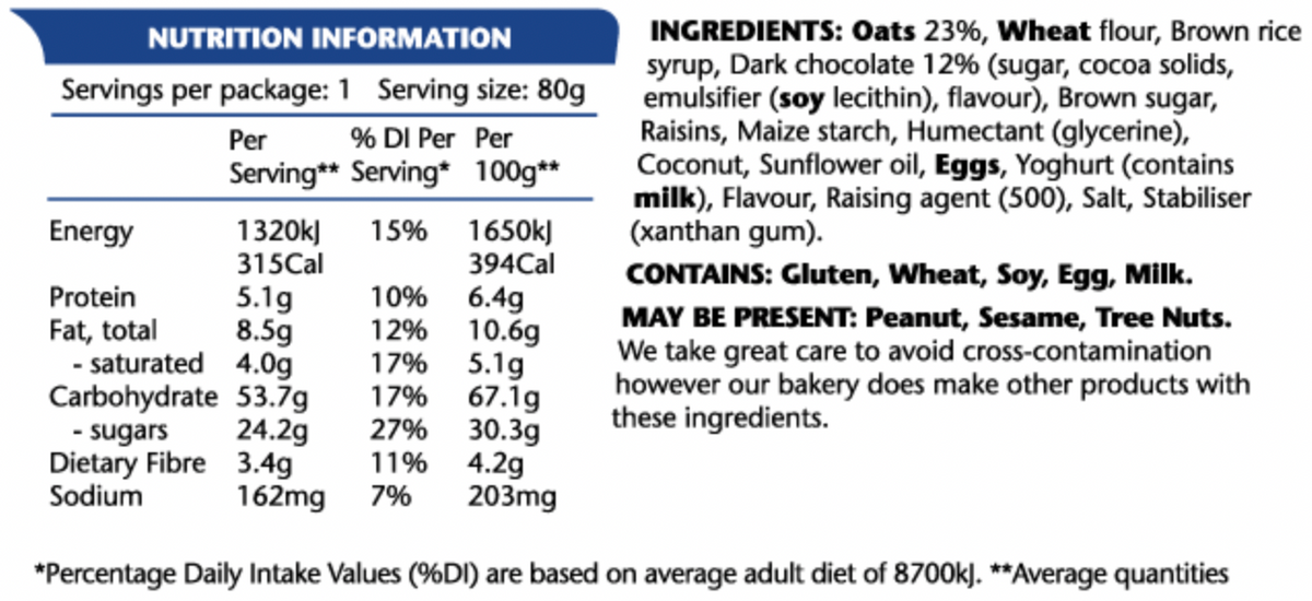 Allergens: Contains oats, peanuts, dairy and soy. May contain gluten and egg.
