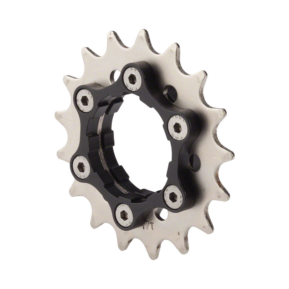 Stamped cogs are inexpensive, but tend to take a bite out of your freehub. Wide profile cogs are great but tend to take a bite out of your wallet. Our Cassette Cog Carrier (CCC) is Shimano-splined and sandwiches a spline-less cog. This gives you a wide profile that won’t damage your freehub and cogs that are less expensive to replace. But wait, are you sitting down? The cogs themselves have a 6-bolt hole pattern just like disc rotors so you can attach them to hubs with disc rotor mounts for fixed-gear use.