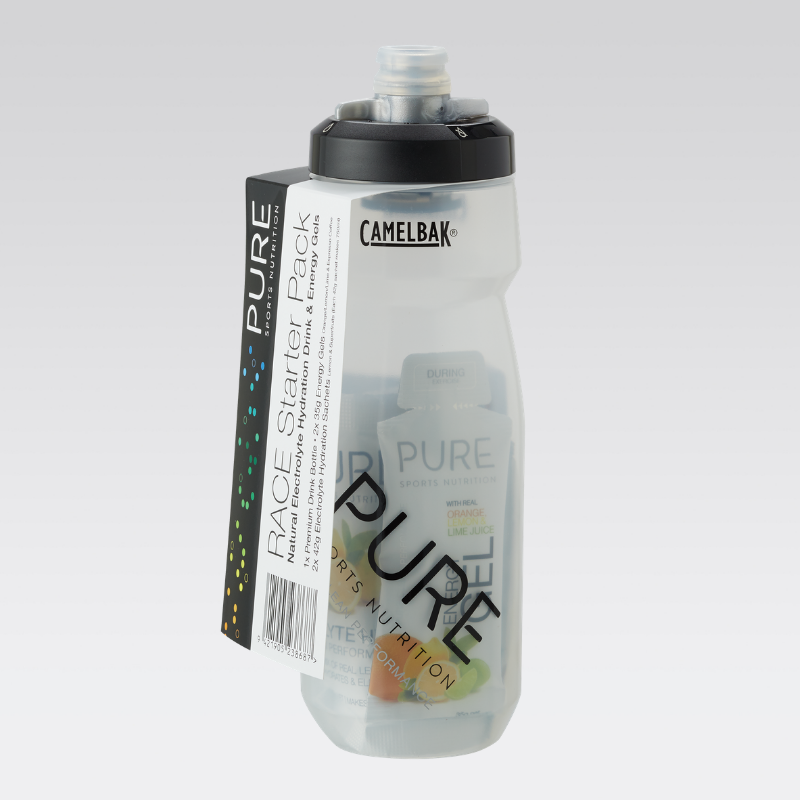 The Race Starter Pack contains the complete package to hydrate and fuel for 2-3 hours. Includes: PURE Electrolyte Hydration - a premium natural electrolyte drink base using real freeze-dried fruit, carbohydrates and electrolytes, PURE Energy Gels - a premium natural sports gel using real ingredients for flavour, carbohydrates and electrolytes and the PURE CamelBak Podium - which redefines the bike bottle with a high flow rate and self-sealing cap. A great gift idea for any fitness enthusiast or to lock in your own race-day nutrition.