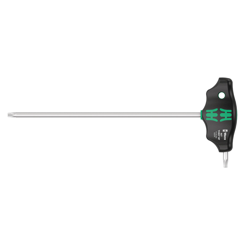 - T-handle screwdriver with holding function on the long arm for a secure hold of the screw on the tool
