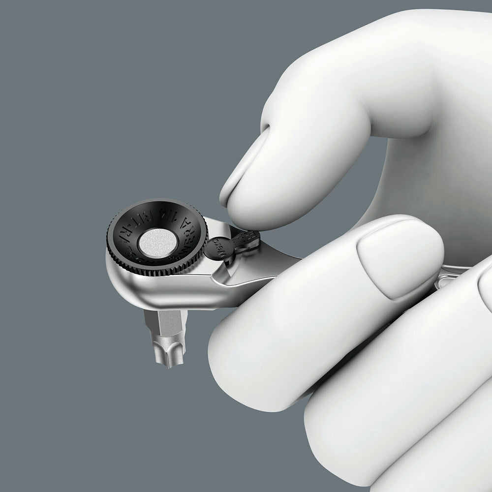 A lot of bicycle tools in a small space. The sorting of the 9 stainless steel bits by profile and size allows quick access to the right tool. With one Wera Zyklop Mini 1 bit ratchet in a drop-forged solid steel design. The fine toothing mechanism with 60 teeth allows a small return angle of 6° for precise working. The knurl allows fast screwdriving in cramped situations, when there is no space for ratcheting. Easy left/right switching. Ergonomically shaped ratchet head and lever. With Take it easy tool finder with colour coding by size - to help you find the required tool quickly and easily.