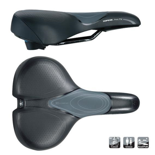 The wide- profile free_TX is the perfect saddle for touring, commuting, and casual riding. Triple density 3D Comfort system eliminates pressure and hot spots while the shock- absorbing BaseFoam with gel inserts supports the sit bones. An elastomer spring suspension system soaks up all bumps for a plush feel.