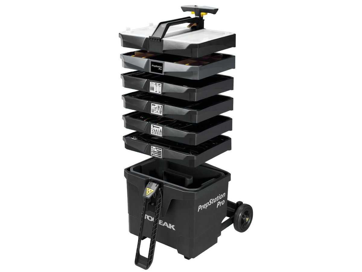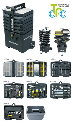 Easy moving trolley tool station with 5” wheels and seven tool compartments containing 55 professional shop quality bike tools (85 functions). Wheel base can be easily pulled out to extend working base for better stability. Push button Lift Handle opens tool trays for quick and easy repairs.