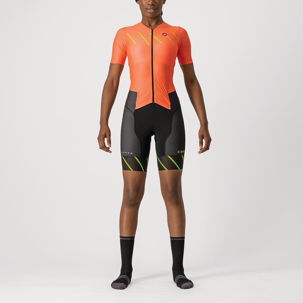 THE GOOD-AT-EVERYTHING RACE SUIT The best triathletes are the ones who are good at everything. That's why we put so much into this suit. Let's start in reverse order: Run: At this point in the race, fatigue sets in. You'll love the comfort of this suit. The front Samremo opening construction doesn't pull you forward, and you can open it up when you feel too hot. The fabrics are quick drying, light and cool. The seat pad that felt so good on the bike is small enough you hardly feel it. The two rear pockets compress your gels so they don't bounce around. The long legs with Giro4 leg gripper elastic don't ride up and don't bind. Maybe you'll even notice that you don't have as many burning spots where you've been chafed raw. Somehow, you're thinking that comfort gives you an extra push, some extra speed. Bike: You relish these couple of hours to put some distance into the other women. This suit benefits from the aero research of Castelli's Pro PR suit but is tuned for speeds ranging from medium to high. The legs and sleeves provide excellent coverage while the back gives decent sun protection and the two pockets hold plenty of nutrition. And you appreciate the Castelli know-how in seat pad construction. Put your head down and pass a few more riders. Swim: The reduced seaming and long arms and legs help you cut through the water while the pockets lie flat and don't catch water. The fit is snug and the lightweight fabrics don't hold as much water. The shoulder area is extra stretchy for freedom of movement even under a wetsuit or swimskin.