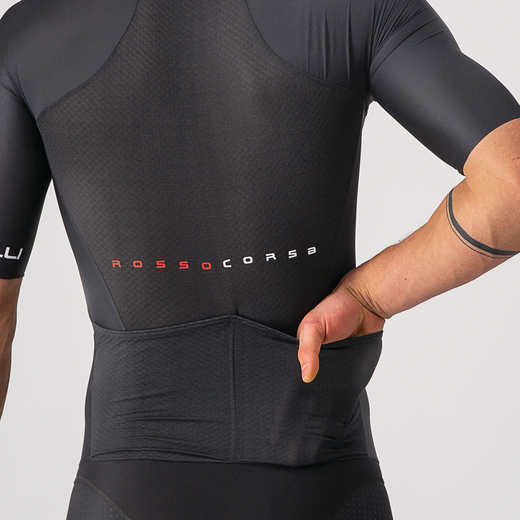 THE ULTIMATE RACE SUIT The Sanremo Speed Suit revolutionized the way pro riders dress when we invented it back in 2011, and we're still surprised that every other manufacturer has simply copied the Sanremo front opening rather than trying to come up with something original. While the front opening is the most visibly unique feature, we've worked on every other detail to make this the perfect race suit. It's aero thanks to our CFD-based seaming and wind-tunnel selected fabrics. It's comfortable thanks to the body fabrics that will keep you drier and cooler than the simple Lycra® fabrics used by some other companies. The lower portion of the suit is our Free Aero Race 4 bibshort, making this our most comfortable suit for your longest, toughest race days. Besides the new fabrics and seam placement, we've also worked on the pockets to make them better for racing. They're somewhat narrower for better aerodynamics, but there are now two big pockets instead of three small ones, so they're easier to access in racing. The Castelli collection version of the Sanremo Speed Suit is in dyed fabrics instead of sublimation printed fabrics like the pros use. The colors are richer and more saturated, making you look even better than a pro.