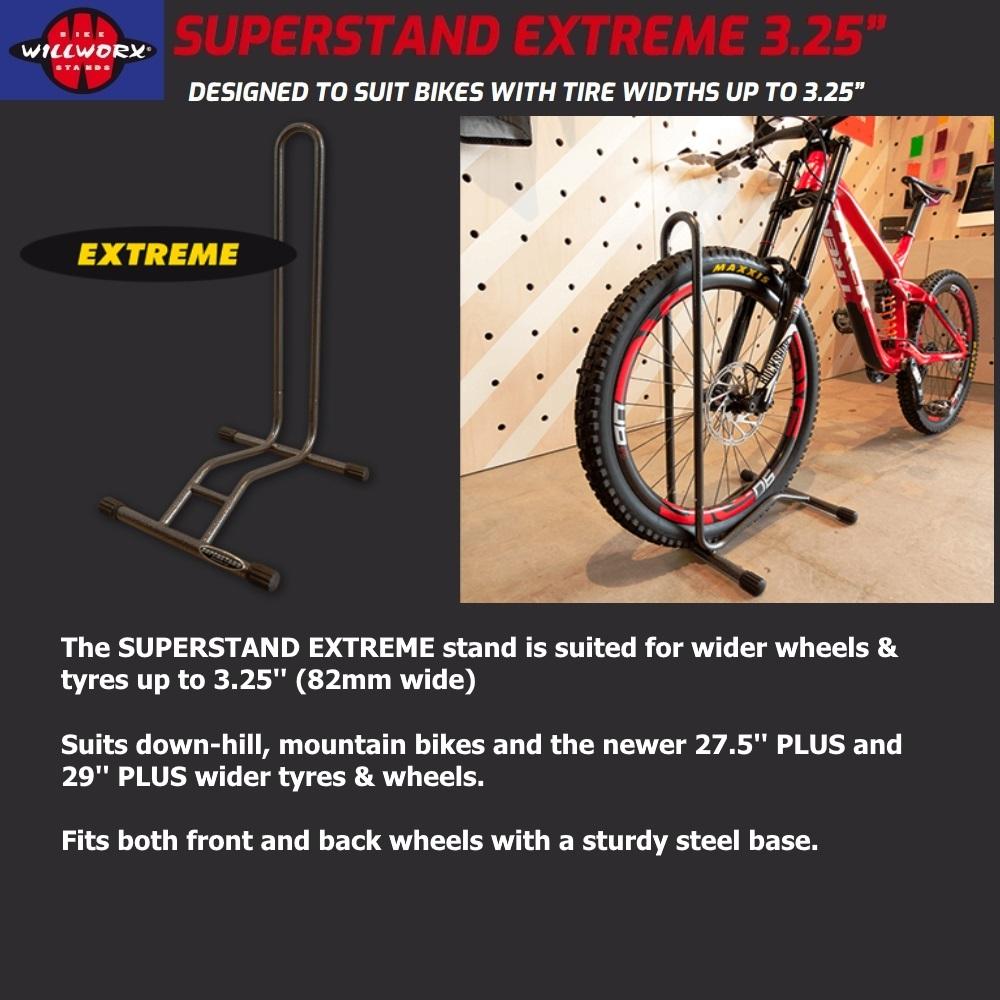 The Superstand Extreme is designed to fit all down-hill and 27.5, 29'' PLUS size tyres. It's sturdy & strong, and is easy to use. Fits tyre widths up to 3.25