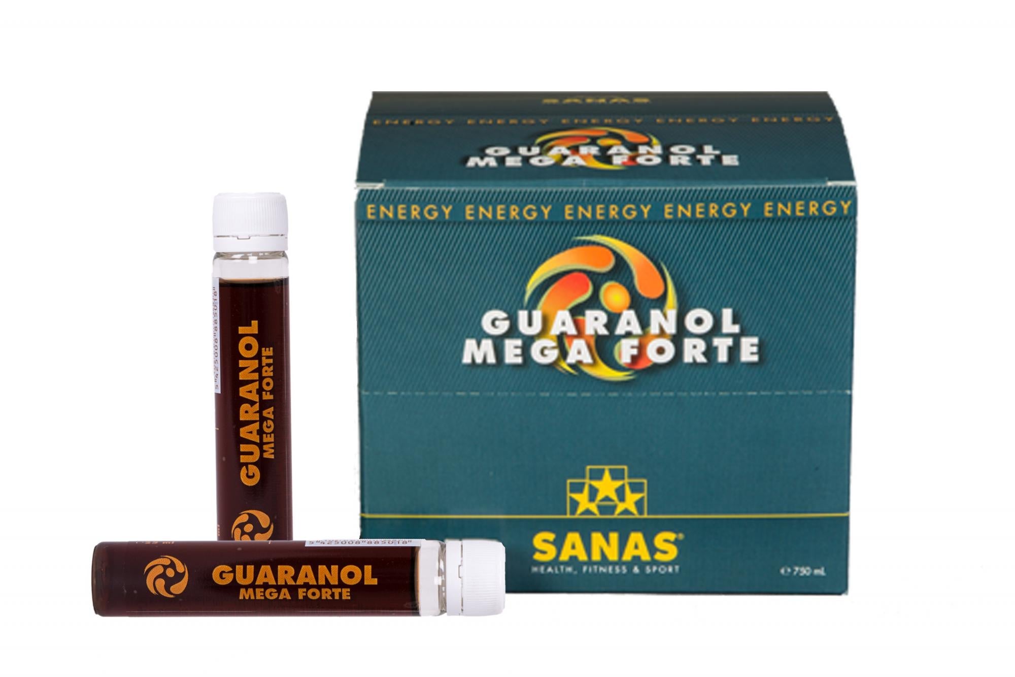 An ampoule contains 160 mg of caffeine, the equivalent of 2 or 3 cups of coffee. In addition, we've added fructose for quick energy and taurine for focus and concentration. Furthermore GUARANOL MEGA FORTE contains the mineral magnesium and a vitamin complex to support various processes in the body.