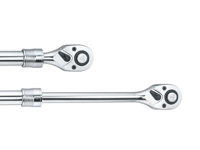 1/2” drive, 72-tooth reversible ratchet for smooth operation. Extendable from 12 - 1/2” (32 cm) to 18” (46 cm) long with 6 locking positions for heavy torque operation. Heavy Duty Chrome Vanadium Steel construction for better wear resistance and tensile strength. TPR handle for comfort and better grip.