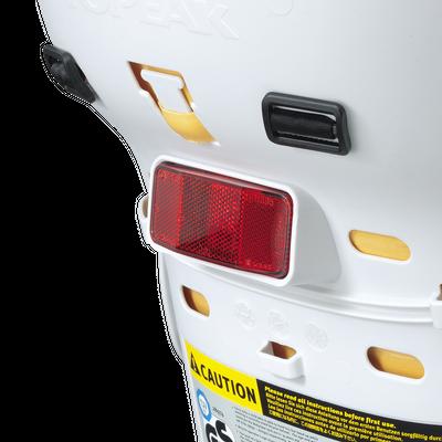 A wrap-around seat structure creates a virtual cocoon of protection and features an updated shoulder harness with a multiple height adjustment system. An innovative suspension system cushions bumps and jolts and the integrated roll bar provides extra head protection and doubles as a carrying handle. Adjustable footrests and straps keep small feet away from spinning wheels. Child seat complies with stringent European, CPSIA and Proposition 65 safety standards. The included heavy-duty disc mount rack features an innovative BabySeat™ attachment that requires no tools to attach and remove seat from rack. Once the seat is removed, the exposed QuickTrack® system is compatible with all Topeak MTX TrunkBags and MTX Rear Baskets.