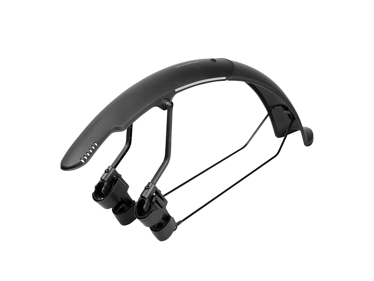 The perfect quick-mount, dual color rear fender that attaches to gravel bike frames with hook and loop straps easily and securely. Adjustable front struts provide a closer fit to the tire and excellent mud / spray protection. Unique two-piece, dual tone design provides short or longer fender usage options for a precise fit with your bike. A highly polished underside helps prevent dirt buildup and aids in cleaning. Included 3M reflective decals provide safety at night.