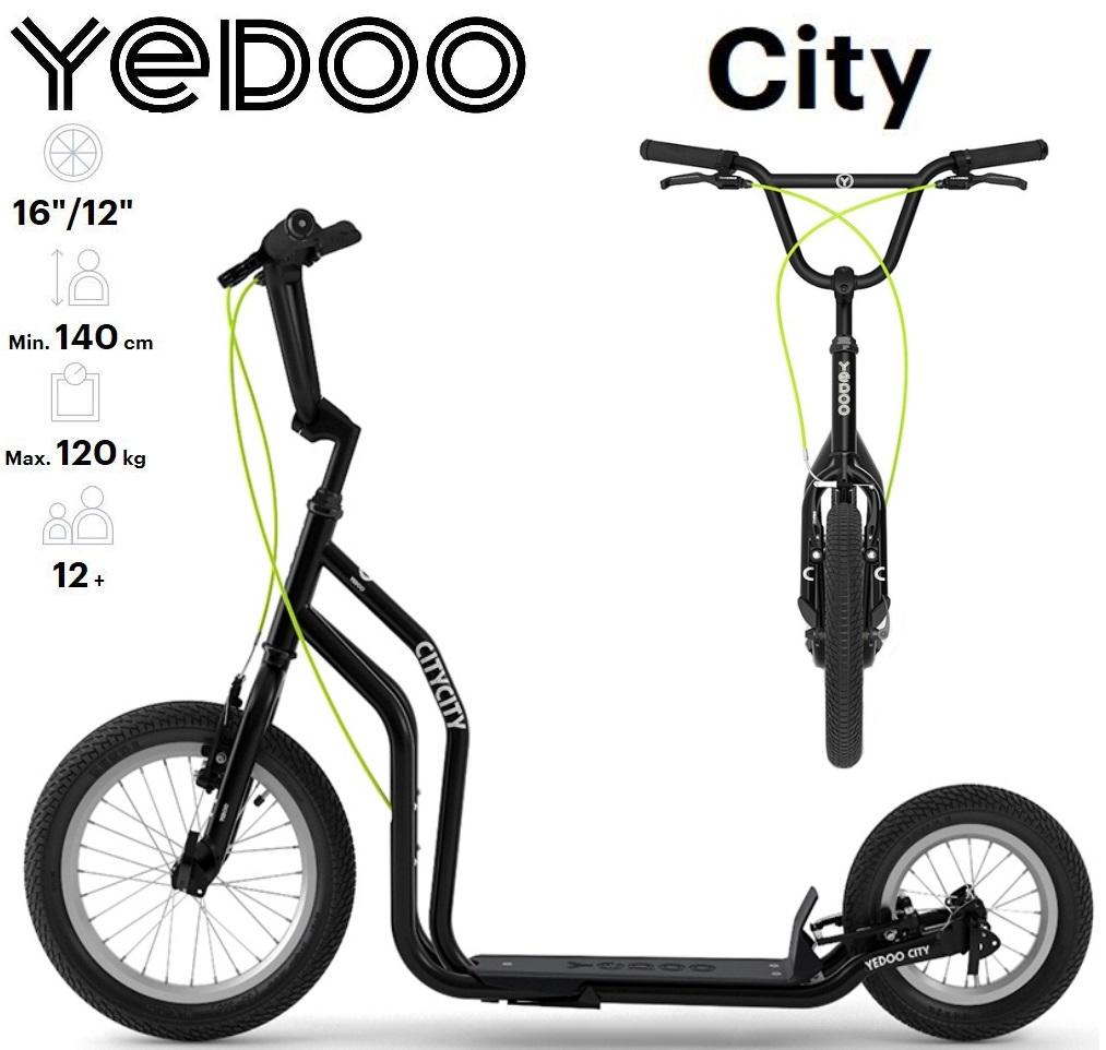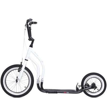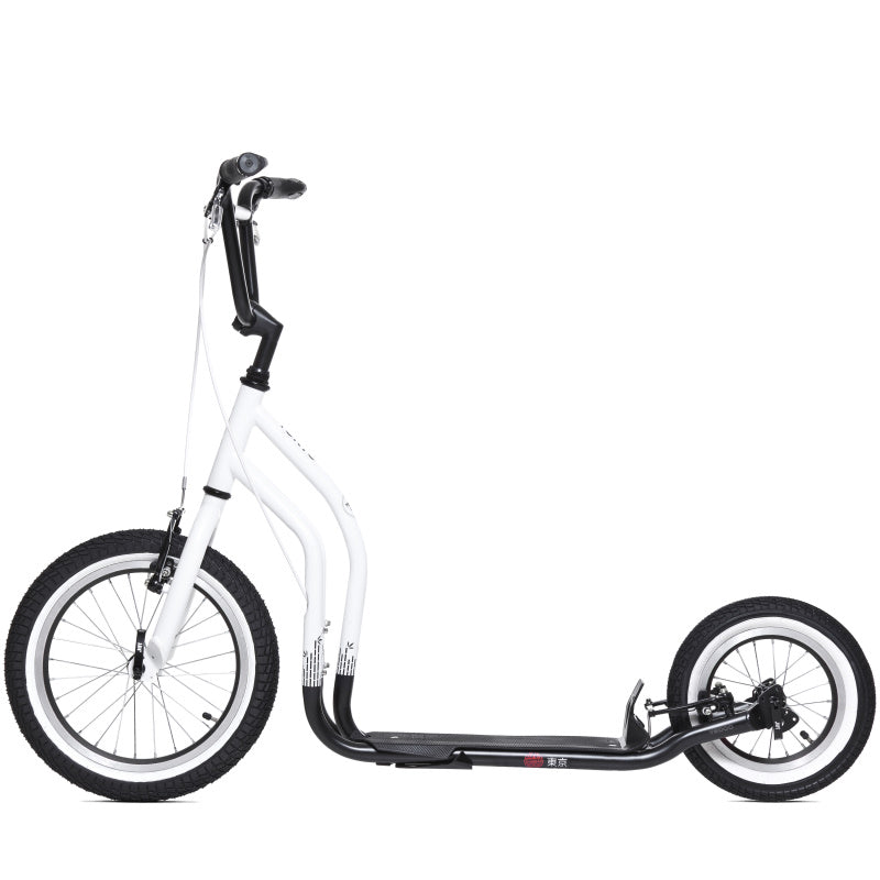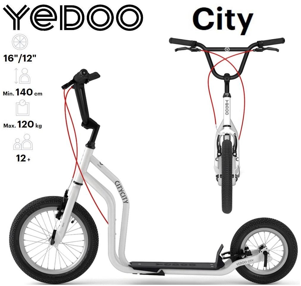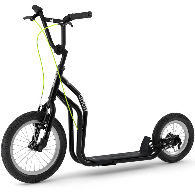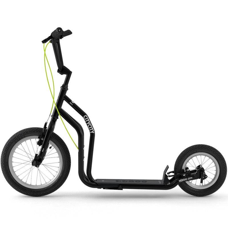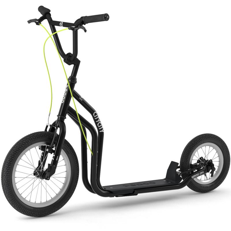 Built tough to carry riders up to 120kg, the City scooter from Yedoo has double walled rims, Tektro V-Brakes, ergonomic lock-on grips, and a lightweight high tensile steel frame. The ride height is adjustable via two rear wheel positions.